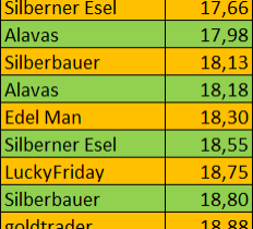 des jeweiligen Gesamteinsatzes der Silberspieler + "x" (s. o.). - Bei Mehrfachbelegung eines Platzes also bspw. zweie ersten Siegern werden die Gewinne der Doppeltipper durch zwei geteilt. Bedeutet, wenn 1. und 2. den gleichen Tipp abgegeben haben, so wird der Gewinn geteilt 50% : 2 = 25 % aller Münzen für beide Erstplatzierten, anzuwenden auch bei mehr als zwei Doppeltipps und auf allen Plätzen analog.
