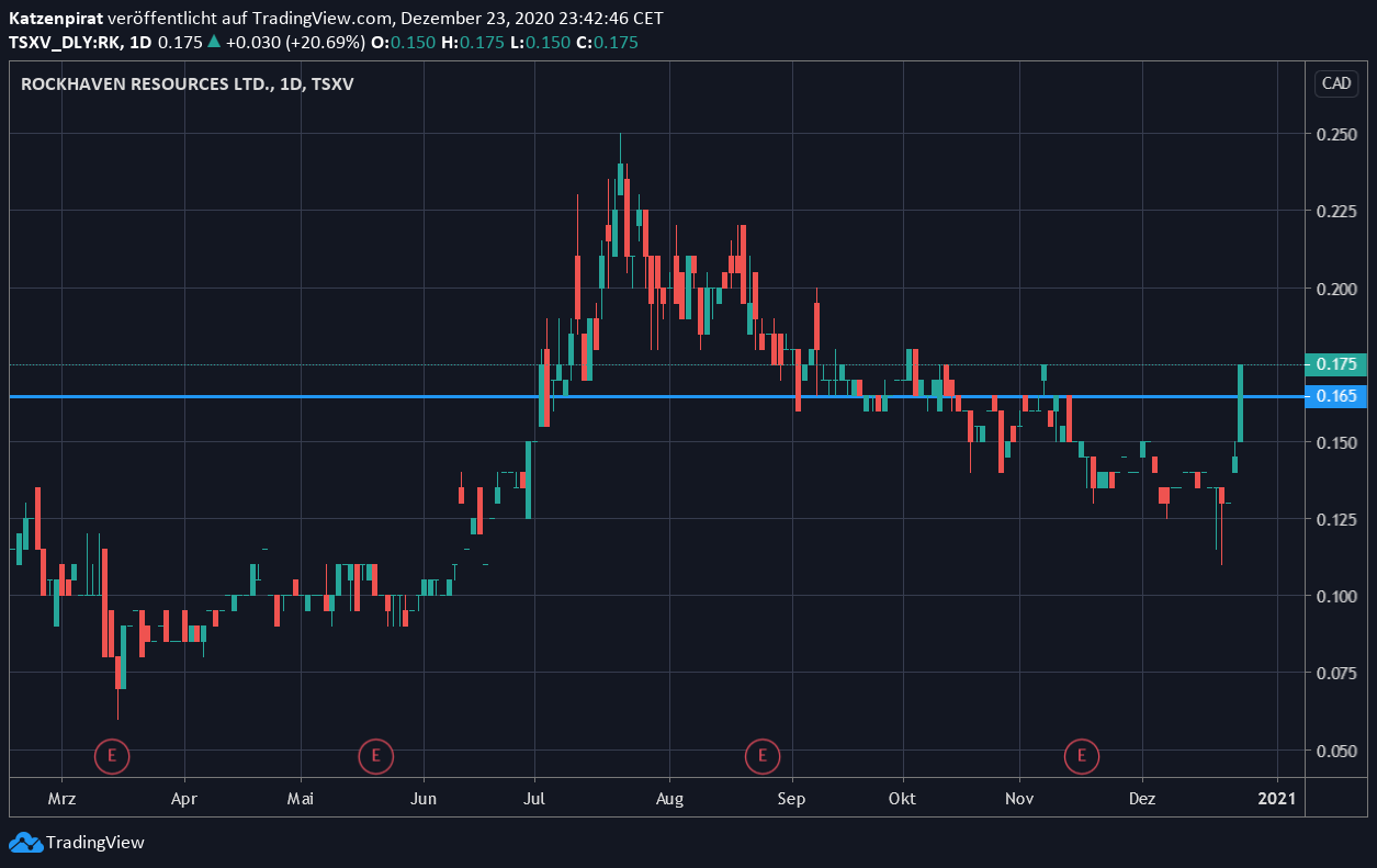 • Rockhaven: Bleibt ein Rätsel. 1.6 Moz AuEq ausgewiesen, MC 21 Mio. Die PEA war ansprechend, die Initial Capex moderat. In den letzten 10 Jahren ist einfach zu wenig gegengen. Der CEO Turner hockt seit 2008 am Ruder. Was macht der den lieben langen Tag?