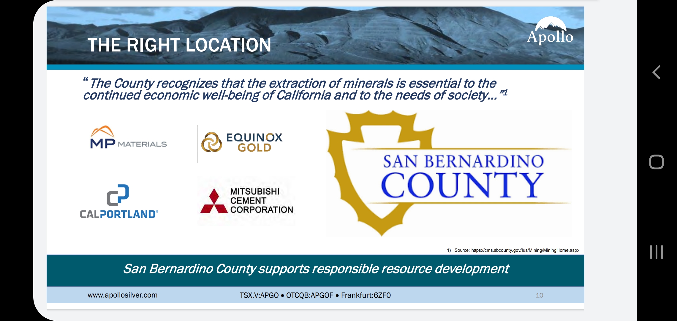 Im folgenden kurzen Interview weist CEO Peregoodoff u.a. darauf hin, dass Kalifornien nicht gleich Kalifornien ist, sondern dass vieles vom County abhängt und dass eben San Bernadino Resourcenentwickler unterstützt.