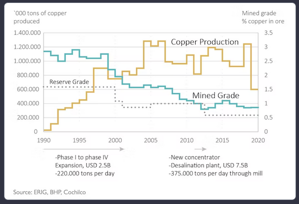 BHP, der drittgrößte Kupferproduzent der Welt, schätzt, dass durch den Rückgang des Erzgehalts bis 2030 etwa 2 Millionen Tonnen pro Jahr an raffiniertem Kupfer wegfallen könnten, wobei durch die Erschöpfung der Ressourcen bis zu diesem Zeitpunkt weitere 1,5 bis 2,25 Millionen Tonnen pro Jahr wegfallen könnten.