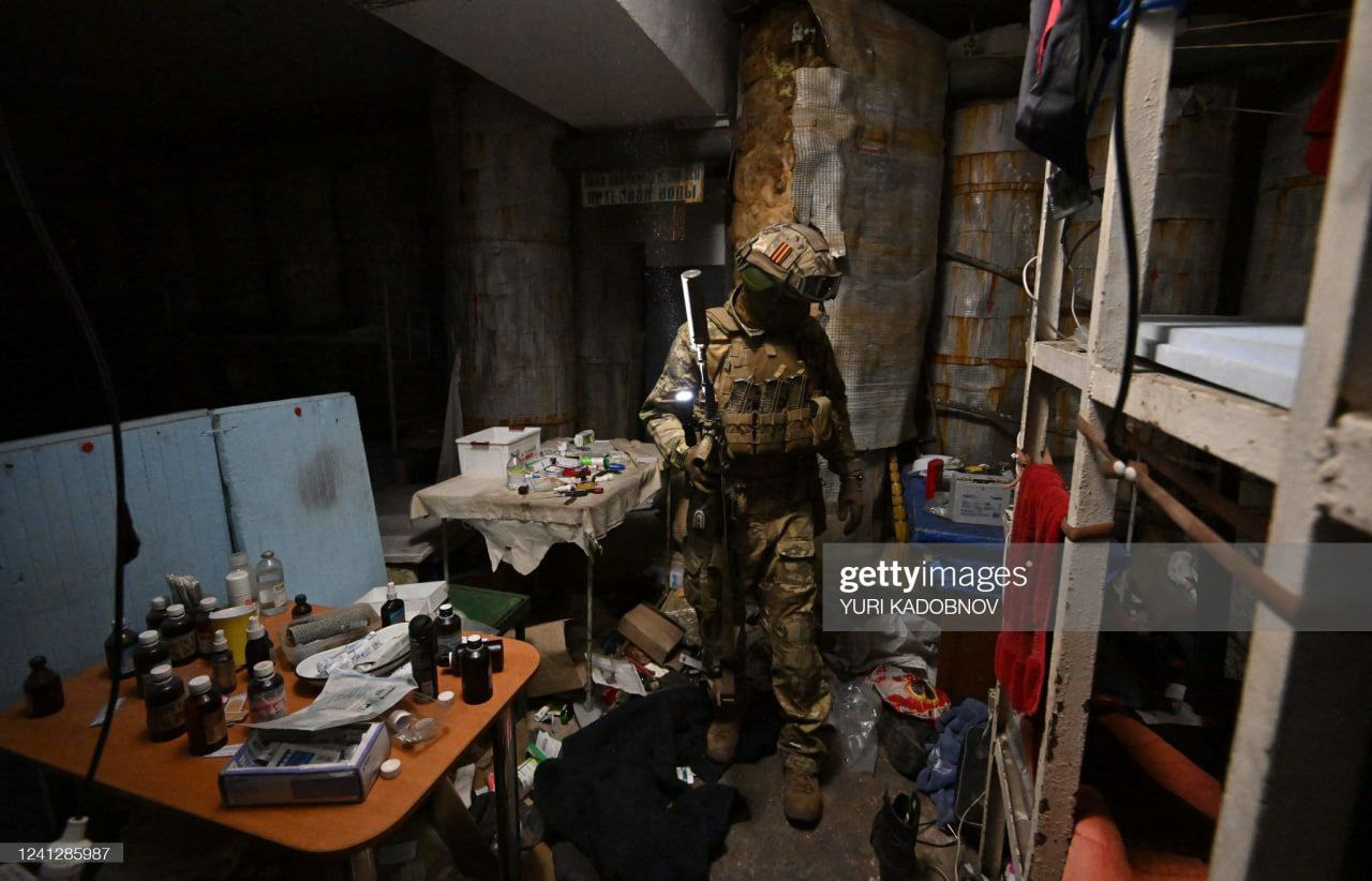 Russische Soldaten untersuchen die Keller von Azovstahl.