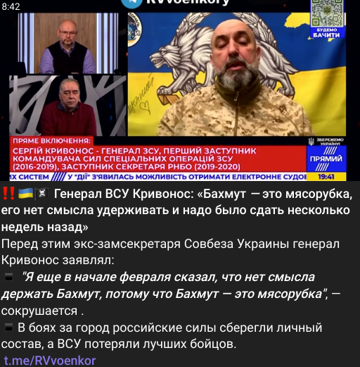 AFU-General Kryvonos: "Bakhmut ist ein Fleischwolf, es hat keinen Sinn, es zu halten, und es hätte schon vor Wochen aufgegeben werden müssen".