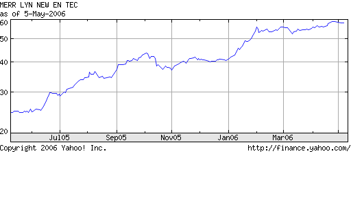 ...our very favourite investment is the Merrill Lynch New Energy Fund. Alternative energy will continue to be the big story and we think, might even eclipse gold as the best investment story over the next few years. This fund has also made a new high - although not an all-time high because, when first launched in April 2001, it was thought to be a bit of a joke and, following launch, suffered a considerable setback. However, it is now well set on an upward path.