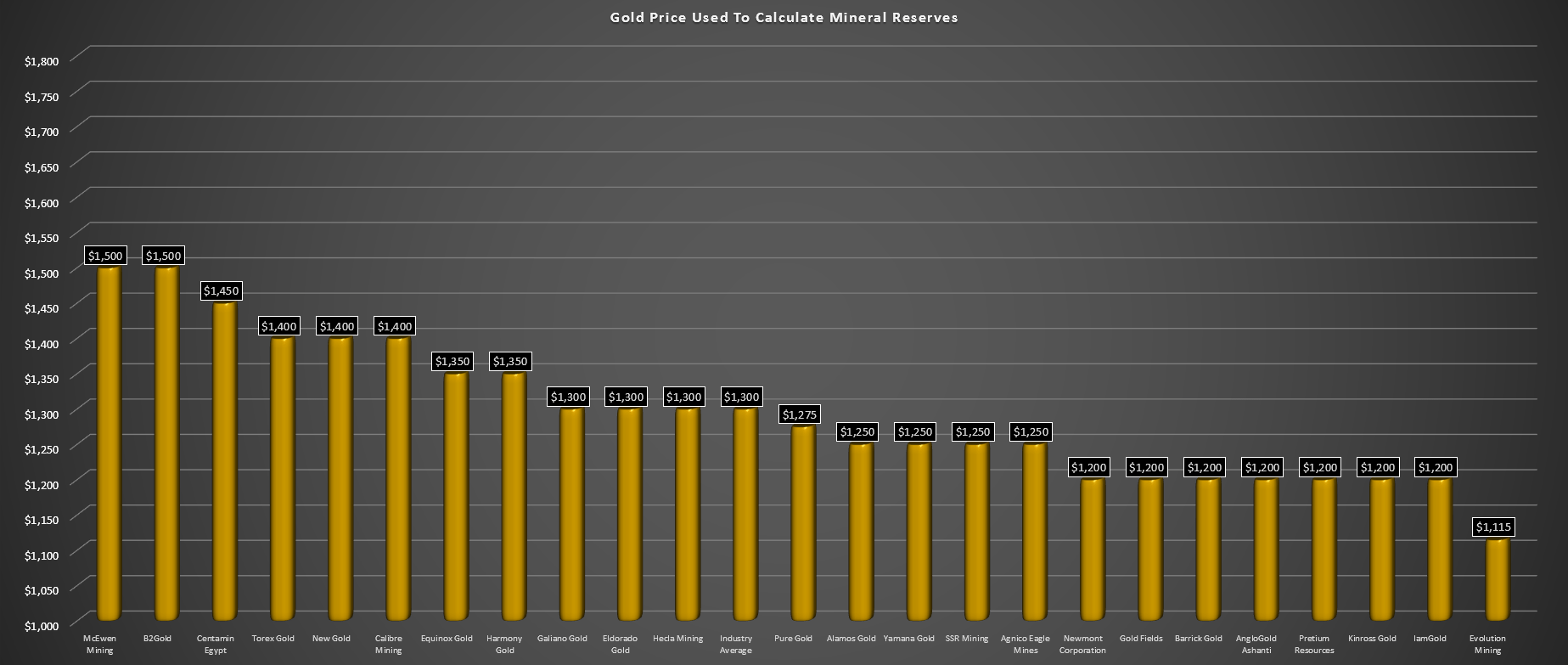 Abschließend wäre ich nachlässig, nicht darauf hinzuweisen, dass dieses Reservenwachstum nicht dadurch erreicht wurde, dass man die Goldpreisannahmen höher angesetzt hat, um ein Wachstum nach der Erschöpfung zu zeigen, sondern dadurch, dass man seine Disziplin beibehalten hat. Wie unten dargestellt, hat Barrick Gold mit 1.200 $/oz weiterhin eine der niedrigsten Goldpreisannahmen in seiner Vergleichsgruppe. Im Gegensatz dazu haben einige andere Unternehmen ihre Gold-/Silberpreisannahmen nach oben korrigiert, um zu vermeiden, dass sie im Jahresvergleich einen bedeutenden Abbau melden. Dies macht das Reservewachstum noch beeindruckender.