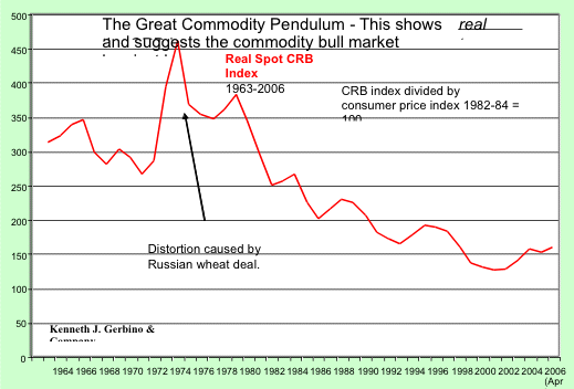 The graph below shows that adjusted for inflation, the strong commodity bull market that started in 2001 has barely begun to catch up in real terms to the general price level of everyday goods and services in the 1960's. This graph implies that a doubling of commodity prices from 2006 levels would only take the index in real terms to the price levels of the 1960's. Therefore commodity prices should continue to trend much higher over the next decade. This graph makes a strong case for investing in companies that own or produce natural resources especially precious and base metals.
