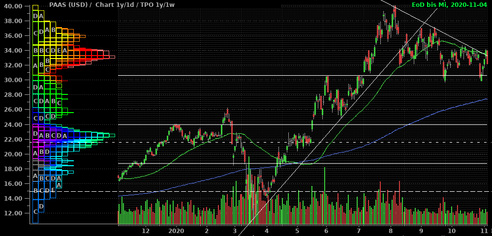 Charttechnisch sind sie in einer spannenden Situation mit einem möglichen Fehlausbruch über den Abwärtstrend. In meinen Augen muß sie jetzt drehen oder einen abschließenden Einbruch hinlegen. Setzt sich die Underperformance gegenüber dem PoG fort und hält die $30 nicht, sind die blaue 200Tage-Linie sowie besser noch die $22-$24 interessante Gelegenheiten, um günstig aufzustocken. Also kauft mir dort nicht alle Aktien weg ![]()