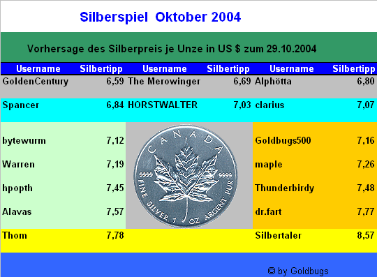 Bitte gebt wegen der Chancen Gleichheit den Tipp per [Blockierte Grafik: http://www.goldseiten-forum.de/images/pm.gif] an Goldbugs500 ab.... so weiß vorher keiner wie der andere sich positioniert hat...