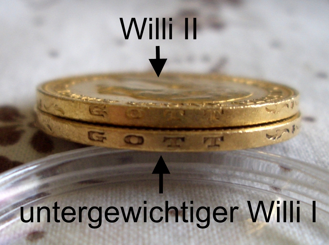 habe mal bei einer münzboerse eine handvoll preussen 20 an 2 selbst ernannte spezis zur ueberpruefung und beurteilung gegeben. unabhaengig von einander wurden ca 12 stueck als falsch aussortiert (waren uebrigens alle von einem wiesbadener haendler), habe alle mit einem filzstift als fraglich gekennzeichnet, zu hause auf 900 gold getestet, war nicht erfolgreich, und am ende in meiner verzweiflung mit einer mikrometerschraube ausgemessen. alle als gut befundenen stuecke hatten 1,32 bis 1,37mm gemessen ueber der backe, links vom schnurrbart. alle falschen stueck. hatten eine staerke, wieder gemessen ueber der backe von mehr als 1,5mm, bis zu 1,7mm hoehe. das gewicht hat mehr oder weniger gestimmt, soweit wie eine 2 stellige china waage fuer weniger als 10 euro eine reproduzierbare wiegegenauigkeit und wiegewiederholung bei der zweiten stelle haben kann. klar, das minderwertige gold muss durch eine groessere hoehe ausgeglichen werden, sonst haben wir das falsche gewicht.