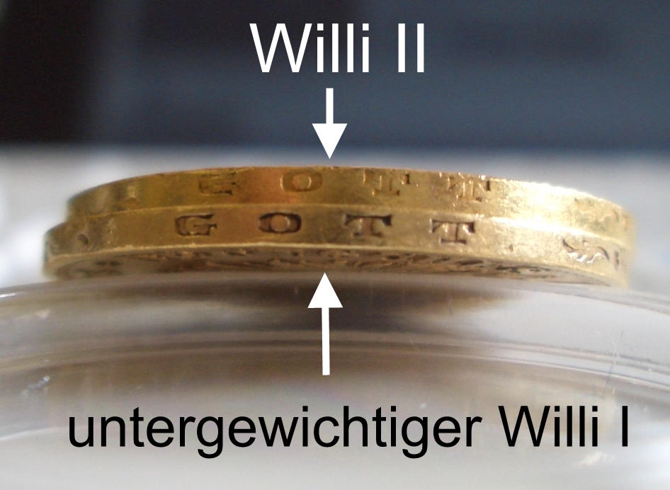 okay, damit können wir Fehler beim Verwiegen ausschließen. Hmm, kannst du uns von der Randschrift der beiden Münzen jeweils ein Foto des Wortes "GOTT" einstellen? Alleine durch das Wort Gottes
