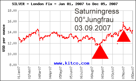 Betrachtet man nachträglich die im voraus veröffentlichten Aussage von Spica zum Übertritt des Saturn in die Jungfrau, der am 03.09.2007 erfolgte, und blickt in die beiden Charts von Gold und Silber, weil wie dargelegt, mit einem erheblichen Anstieg des Gold- und des Silberpreises zu diesem Zeitpunkt zu rechnen war, so sieht man, wie der Goldpreis vom Anfang September bis Anfang November 2007 regelrecht explodierte.
