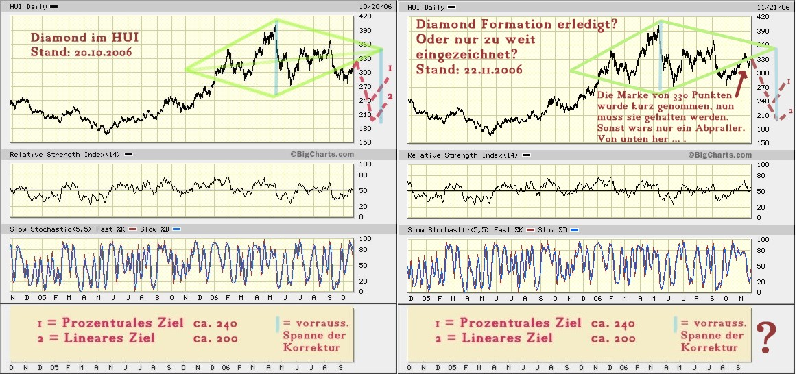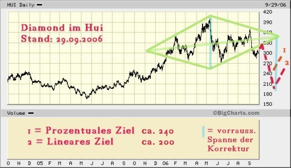 Eine Änderung würde ich daher gerne anmerken. Bisher bin ich davon ausgegangen, dass die Gegenbewegung bis 320 Punkte im HUI nach oben gehen könnte.