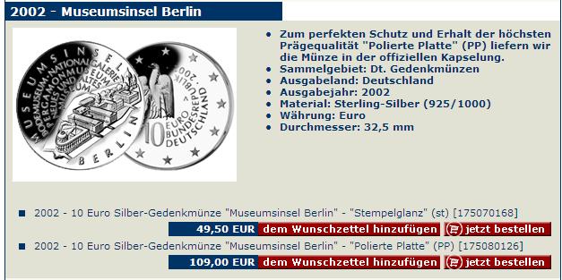 Ich möchte nur mal darauf hinweisen, dass es schlichtweg völlig egal ist beim Erwerb von 10 €- Münzen, ob diese geschüttelt oder gerührt sind. Der Wert bemisst sich ausschließlich nach dem Silbergehalt nämlich 925 Sterlingsilber. Mehr als den Nominalwert wird bei den aktuellen Emissionen niemand erzielen. Da handelt es sich lediglich um 16,65 Gramm Feinsilber für 10 €, also noch immer völlig "überbezahlt" selbst ohne Mehrwertsteuer. Meine damit für etwas über eine Feinunze, also 33,3 Gramm bezahlt man 20 €. (Zwei Stück). Es wird noch einiger Inflation bedürfen bis der Mehrwertsteuerfreie Erwerb sich einmal rechnet. Selbst für Münzsammler lohnt sich der Erwerb einer "gemeinen" unzirkulierten 10 Eurosondermünze bislang nicht. Sammler ordern ohnehin gegen weiteren Aufpreis die "polierte Platte" in Kapsel und zahlen für ihr Hobby nochmals mehr. Ein Hobby ist aber immer relativ kostspielig und zumeist bekommt man nich das eingesetzte Geld zurück.