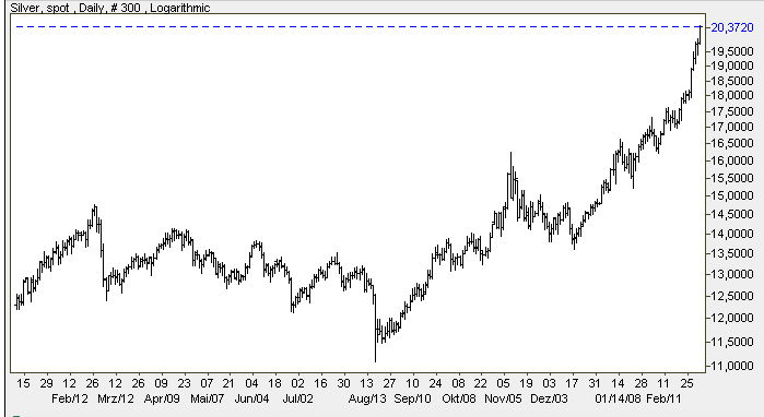 Christian, noting the price of silver touched US$19.80 in New York on Friday, predicted the price will rise above 1980's annual average price of $21 - $22 per ounce. The price did spike as high as $48 on an intraday basis in London and New York in January 1980, but fell quickly and averaged around $38 for the full month of January that year. On an inflation adjusted basis, the daily high price would be about $96 today."