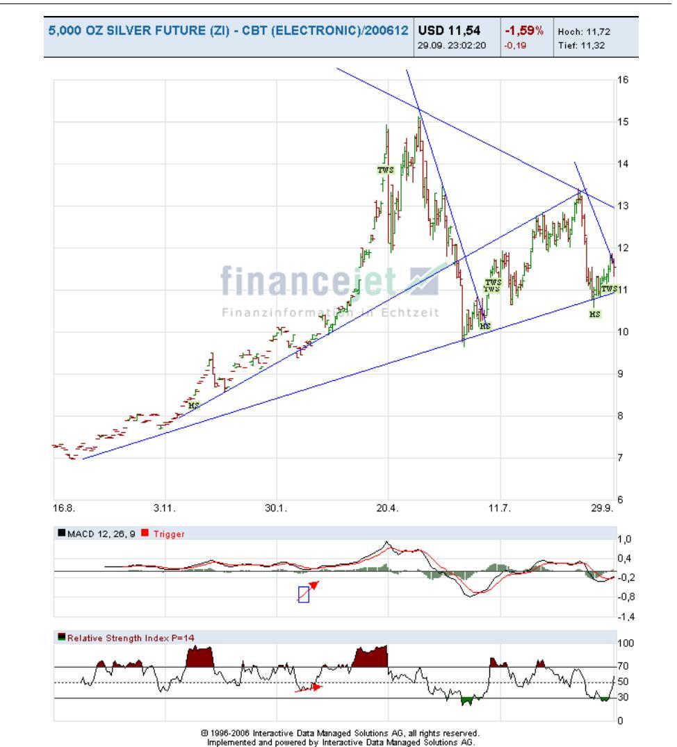 Das letzte Mal, wo der Kursrutsch einen Schlüsselmoment erwischte, war, wie gesagt, der Kursrutsch, der um den 11.09.06 hin orientiert war. Gleichzeitig war ein Chartmuster ausgebildet, das eine Entscheidung (up / down) nahelegte. (Dreieck, oder zeitlich weiter betrachtet, Diamond Formation.)