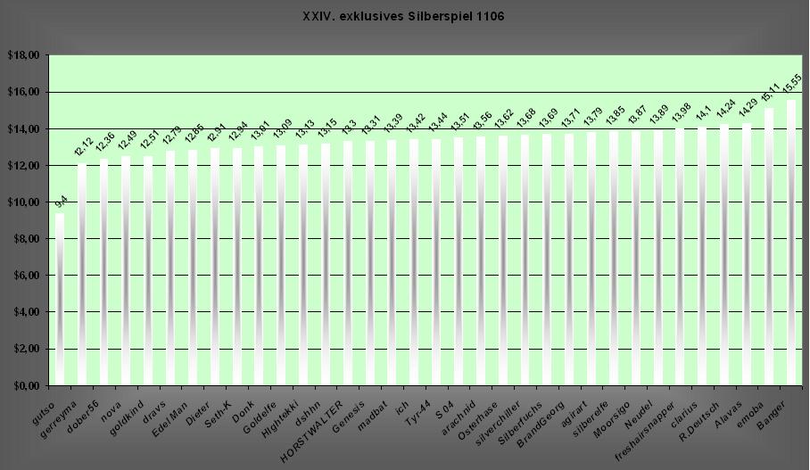 Zitat"§ Gewinner unseres Spieles wird der Silberspieler sein, dessen Tipp zum letzen Handelstag des Spielmonats, dem tatsächlichen Silberkurs zu diesem Zeitpunkt (Kitco NY) am besten entspricht. Es gilt der Schlusskurs in US-$"