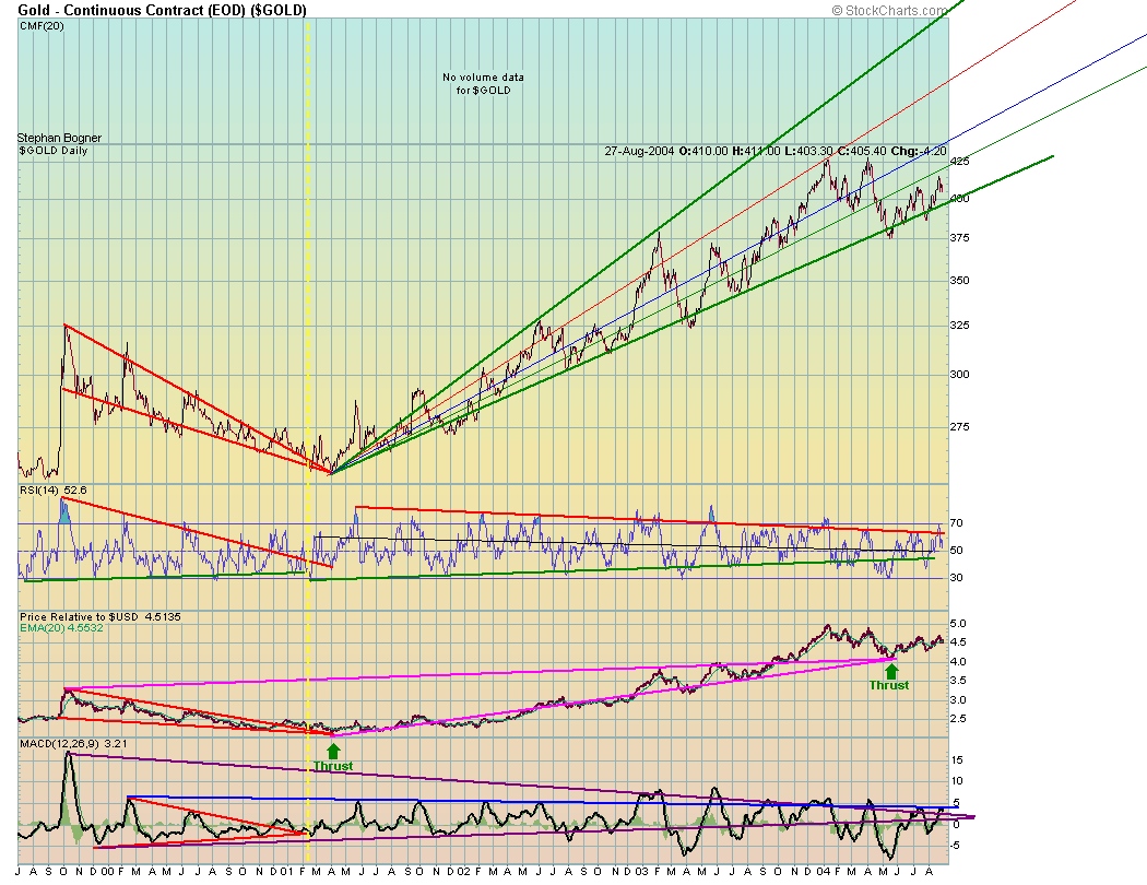 Schaut man sich nun ein wenig laengerfristigeres Chartbild des Goldes an, so erkennt man, dass sein Preis seit Mitte August die obere Schenkelbegrenzung gebrochen und verlassen hat (Breakout). Da es seit Verlassen dieses Schenkels keinen Pullback auf Tagesschlussbasis gab, und der Goldpreis seit mehreren Tagen faellt, koennte angenommen werden, dass der Pullback nun vollbracht wird, indem der Goldpreis den oberen gelben Schenkel bei momentan exakt $400 beruehrt. Ein leichtes Unterschreiten bzw ein Zurueckkehren des Preises in das Dreieck mit haltender Unterstuetzung des unteren Schenkels liegt im Bereich des Moeglichen und sollte nicht negativ gewertet werden. Erst bei Verlassen des unteren Schenkels ist der kurzfristig orientierte Goldinvestor mit taeglicher Vorsicht und Handlungsbereitschaft gut beraten, um sich vor einem mehrtaegigen crashartigen Thrust nach unten abzusichern:
