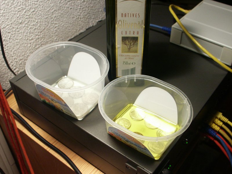Bild 2: Die Schale mit dem Olivenöl stelle ich warm, hier auf meinen Netzwerkswitch. Die Zweite Schale steht da schon eine Woche lang und man sieht schön, wie das Öl seine Farbe verändert hat. Es ist dann so dünnflüssig wie Wasser und die reinigende Wirkung ist damit erschöpft.