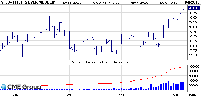 Der zur Zeit meist gehandelte Futur für Dec 2010 weist kein siknifikaten höheren Umsatz auf. Einzig das Open Interesst, die offenen Positionen steigen an.