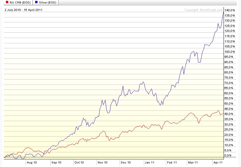 Die Korrelation von Silber mit dem CRB hast Du mit einem stark geglättetem Silberpreis dargestellt. Der CRB hat sich im Darstellungszeitraum schließlich nicht mal verdoppelt, Silber jedoch fast vervierfacht. Diese Erläuterung hätte für den oberflächlichen Betrachter, meines Erachtens hinzugefügt werden sollen. Auf den einfachen Blick scheint es sonst, der Silberpreis korreliert zwar stark, liefe aber dem CRB hinterher.......