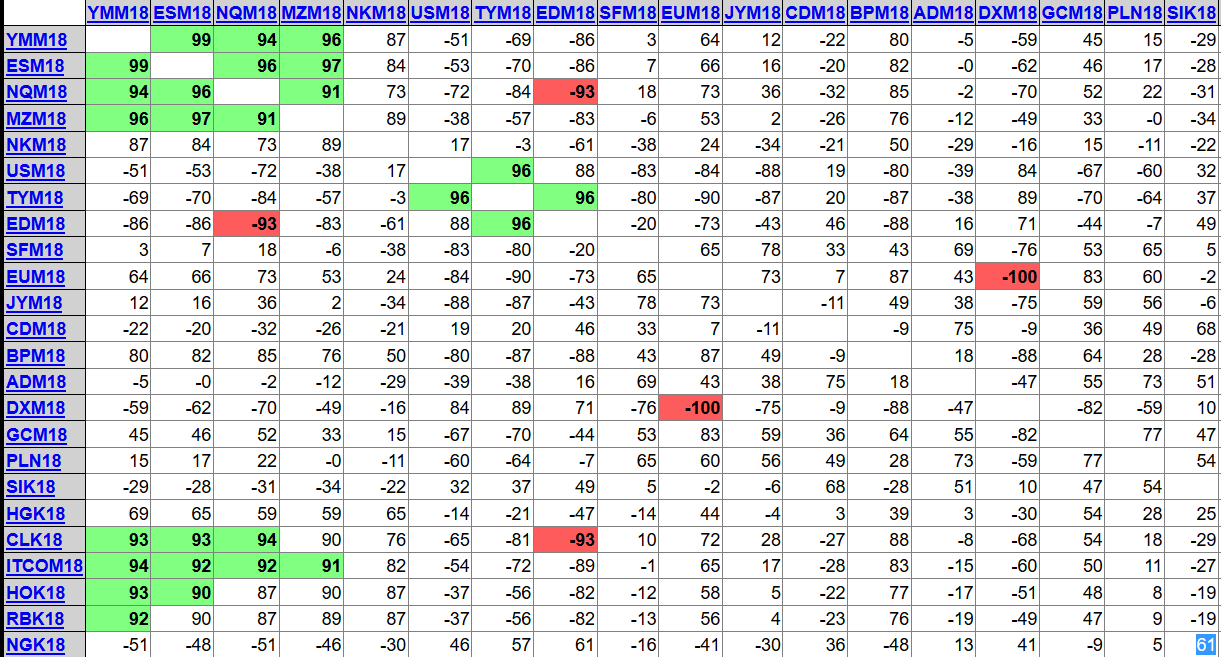 Silber (SIK18) hat mit - 0,29 eine negative Korrelation zu Crude Oil (CLK18).Interessant finde ich, dass die positive Korrelation von Silber zu Natural Gas (NGK18) mit 0,61 relativ hoch ist.