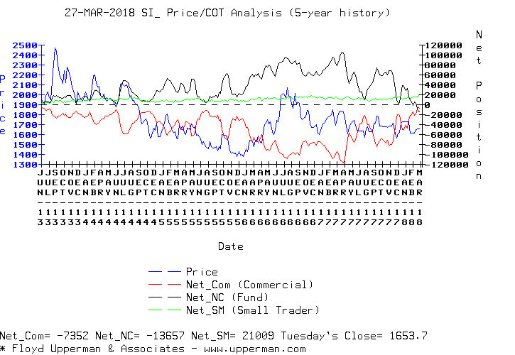 Die Netto-Short-Position der Commercials (Smart Money) hat sich nur unwesentlich verändert und beträgt jetzt 7.352 Kontrakte. Das entspricht einem Anstieg von nur 3.643 Kontrakten zur Vorwoche während der Silberpreis von 16,20 $ auf 16,53 $ stieg.
