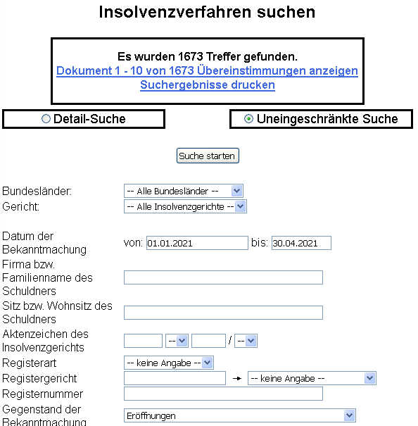 Wenn du von 01.05.2020 bis 30.04.2021 Filters bekommt du 19609 Insolvenzen.