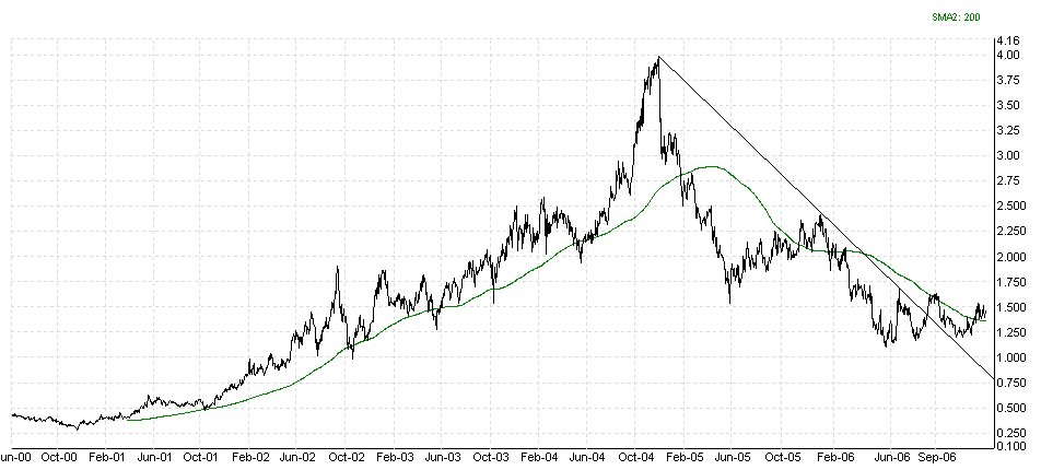 ".....So note the first trend line I have drawn. Not only is silver outperforming gold, but also it is increasingly outperforming gold! If we extend that trendline it hits 1.80 at the end of 2010. However, we also have a faster trendline that began earlier this year that suggests 100% leverage on any return on gold by the end of 2007....."