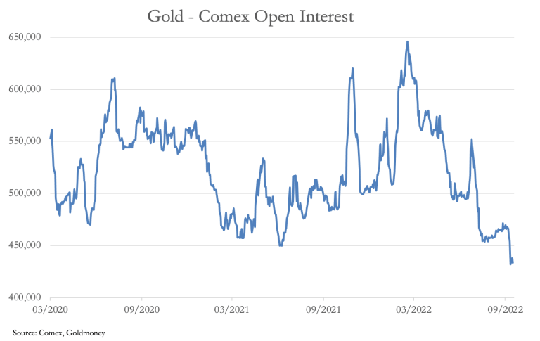 Die Gold- und Silberkontrakte sind extrem überverkauft, wobei die Managed-Money-Kategorie bei Gold am 27. September (dem letzten Commitment of Traders Report - die Aktualisierung der Position soll heute Abend, am 4. Oktober, erfolgen) netto 3.094 Kontrakte leer ausging. Bei Silber betrug die Netto-Leerverkaufsposition von Managed Money 8.093 Kontrakte. Eine andere Betrachtungsweise ist das offene Interesse, und dieses steht bei Gold als nächstes an.