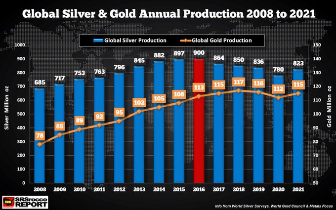 Der Höhepunkt der weltweiten Silberproduktion wurde wahrscheinlich 2016 mit 900 Mio. Unzen erreicht, während das Verdikt für die Goldproduktion, die 2018 einen Höchststand von 117 Mio. Unzen erreichte, noch aussteht.
