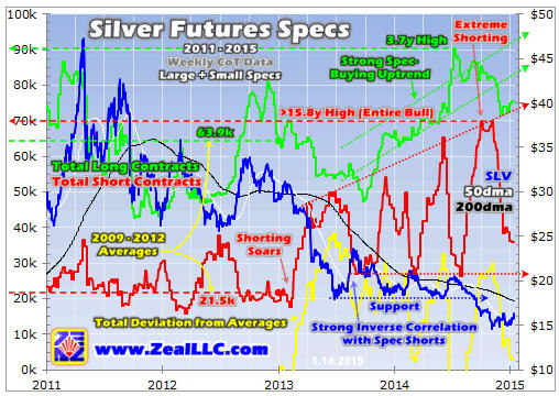 ZitatAlles anzeigenNoch krasser sieht es aus, wenn man die Monate Juni – November 2014 heranzieht, in denen 43.700 Kontrakte glattgestellt wurden. Dies entspricht einer gewaltigen Summe von 92,6 Mio. Unzen Silber. Somit war klar, dass Silber nur eine Richtung kannte, nämlich weiter ins Minus zu rutschen. Eine ähnliche Situation hatten wir schon im Jahr 2001 erlebt, als ebenfalls innerhalb kürzester Zeit 70.000 Kontrakte aufgelöst wurden. Nur damals war, auch wenn jeder Kontrakt auch damals bereits 5.000 Unzen umfasste, der Wert ein wesentlich geringerer, da Silber in etwa bei 4 USD je Unze notierte.