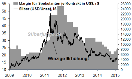 ZitatDie jetzigen beiden Erhöhungen von 7.150 auf 8.470 US-Dollar finden innerhalb von zwei Wochen statt. Mitte Juli 2014 senkte man die Margin von 9.075 US-Dollar auf 8.250 US-Dollar interessanterweise bei einem Silberpreis von damals rund 21 US-Dollar. Jetzt wird die Margin knapp über 17 US-Dollar auf 8.470 US-Dollar angehoben.