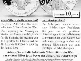 Silver Eagle á 10,00€ (portofrei) von MDM bis 3x soll möglich sein.