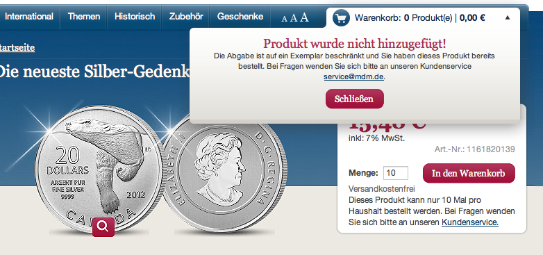 .Die Bestellung funktioniert; addieren koennen sie offensichtlich aber nicht: eine war beim letzten Mal durchgegangen, maximale Anzahl fuer die zusaetzliche Bestellung auf 8 Stueck reduziert - naja, ich will trotzdem mal nicht meckern....