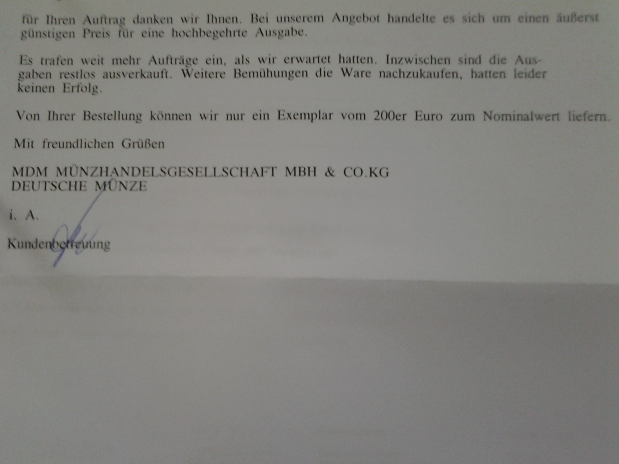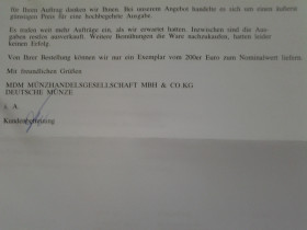 vielen Dank für Ihre Zeilen. Wir bieten nur Münzen an, die uns auch zur Verfügung stehen. Nun kommt es in jeder Branche vor, dass bei bestimmten Artikeln der Ansturm ungeahnte Ausmaße annimmt. Die Lieferung erfolgt grundsätzlich nur, solange der Vorrat reicht. Wie auch in unserem Angebot vermerkt.