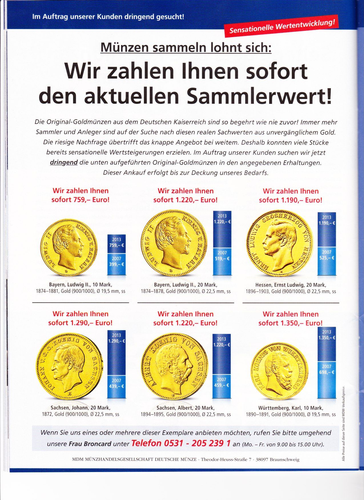 gerade das Deutsche Münzen Magazin aus dem Briefkasten gefischt und dieses Ankaufsgesuch endeckt. Bei den Preisen eventuell für den Ein oder Anderen interessant.