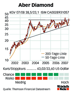 Nicht ungelegen kommt Aber der Plan des Joint-Venture-Partners Rio Tinto, den Aluminiumkonzern Alcan zu übernehmen. Möglicherweise wird sich der Bergbauriese im Zuge der Übernahme von seinem gesamten Diamantengeschäft trennen, und Aber besitzt für Rio Tintos Anteil an Diavik das Erstkaufsrecht. Sollte die Aktie ihren langjährigen Kurswiderstand zwischen 40 und 45 US-Dollar überwinden, winken gute Gewinnchancen.