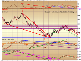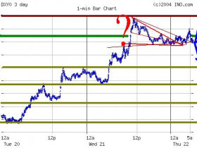 • Der Dollar faellt momentan auf die rote Unterstuetzungslinie. Wenn diese (oder noch tiefer!) erreicht bzw wenig unterschritten bzw