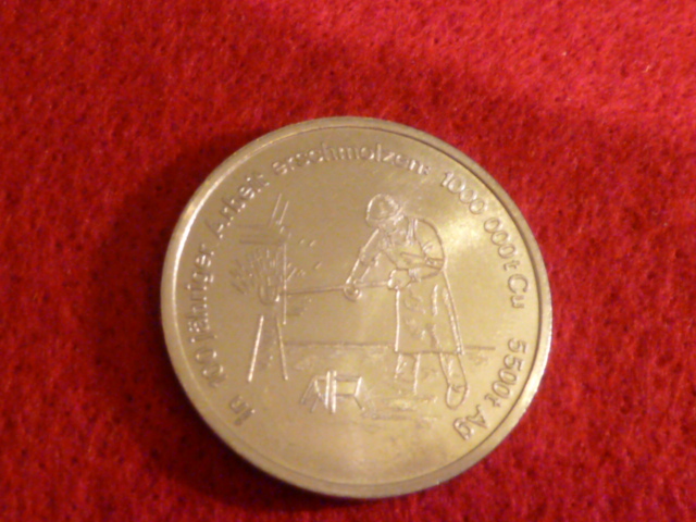 3.) Detailfoto: 100 Jahre Arbeit-August Bebel-Hütte (Cu-Ni) Umschrift: 100 Jahre eingeschmolzen- 1.000.0000 Tonnen Kupfer - 5500 Tonnen Silber