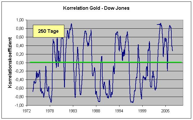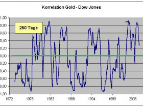 Die erste Grafik zeigt die Korrelation zwischen Goldpreis und Dow Jones. Aufgetragen ist der Korrelationskoeffizient für den Zeitraum von 250 Handelstagen, was etwa einem Jahr entspricht. Man sieht, dass die Preise nicht miteinander korreliert sind, also weder positiv noch negativ. Das bedeutet, dass Gold zwar zur Diversifikation geeignet, aber als "Hedge" ungeeignet ist. Es ist also nicht so, dass der Goldpreis steigt, wenn die Aktienpreise in den Keller gehen.