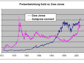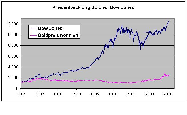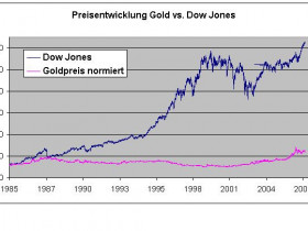 ich hab mir mal die Zeitreihen für den Dow Jones und den Goldpreis von Yahoo gezogen und ein bißchen rumgerechnet.