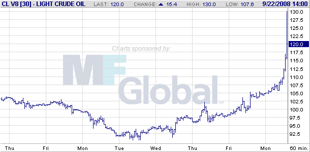 Getrieben von einem schwachen Dollar ist der Ölpreis am Montagabend zeitweise um mehr als 25 Dollar auf 130 Dollar in die Höhe geschossen. Damit verzeichnete er den höchsten Tagesanstieg aller Zeiten.