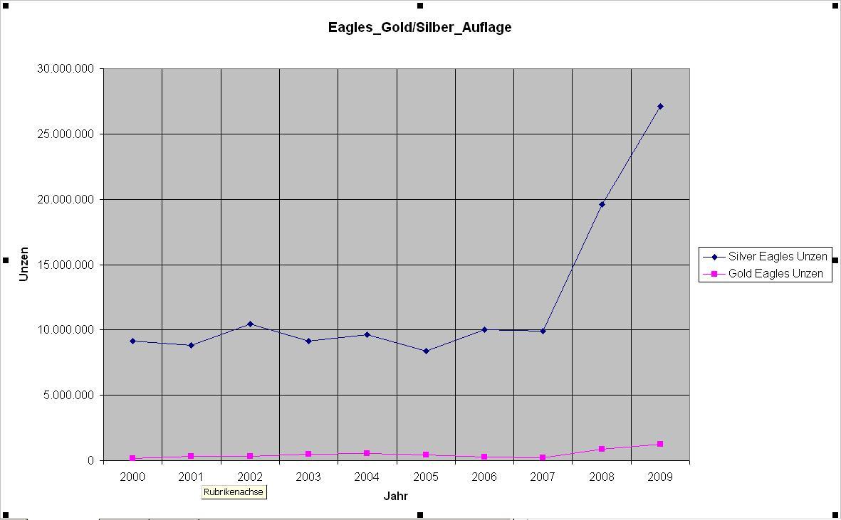 Nachdem jetzt die Zahlen für den Eagle 2009 veröffentlich wurden, hab mich mal eine kleine Tabelle gebastelt. Die Menge sind jeweils Unzen also bei Gold alle Münzen zusammengefasst. Da die Steigerung bei Gold etwas untergeht, hier noch die absoluten Zahlen 207 = 198.500 Unzen, 2008 = 860.500 Unzen, 2009 = 1.262.000 Unzen