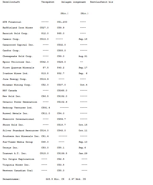 Kanadische Minengesellschaften haben Probleme mit ihren kurzfristigen Geldmarktpapieren. Wie Bloomberg bekannt gibt, stehen für sie zur Zeit Commercial Papers in Höhe von insgesamt 326,5 C$ (311,1 US$) aus. Die durch Anlagevermögen besicherten Geldmarktpapiere können derzeit nicht fristgerecht von den Händlern zurückgezahlt werden. Möglicherweise wird die Liquiditätsknappheit der nicht-institutionellen Händler zu weiteren Zahlungsverspätungen bei zusätzlichen, von den Gesellschaften gehaltenen, Wertpapieren in Höhe von 2,47 Mrd. C$ kommen.