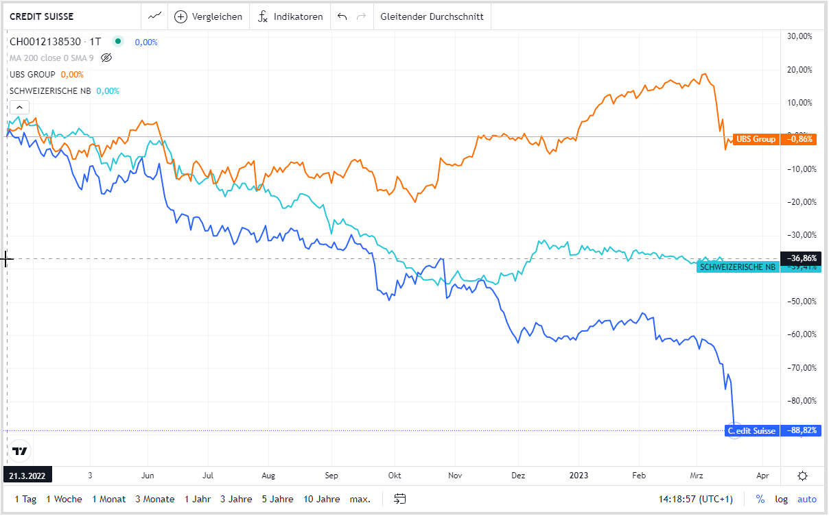 Anbei die Entwicklung der UBS, CS und SNB seit dem 23.02.2022 und einmal in der letzten Woche.