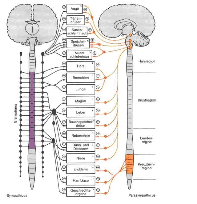 So regt er die Herztätigkeit und den Blutkreislauf an, während er die Darmtätigkeit hemmt. Der Parasympathicus hingegen dämpft den Herzschlag und fördert die Verdauung. Der Sympathicus verwendet als Transmittersubstanz in den Synapsen Adrenalin und Noradrenalin, der Parasympathicus Acetylcholin. Der Sympathicus versetzt den Körper in den Zustand hoher Leistungsbereitschaft, erbereitet auf Angriff, Flucht, Verteidigung und außergewöhnliche Anstrengungen vor.2. Der Parasympathicus sorgt für Ruhe, Erholung und Schonung des Organismus.