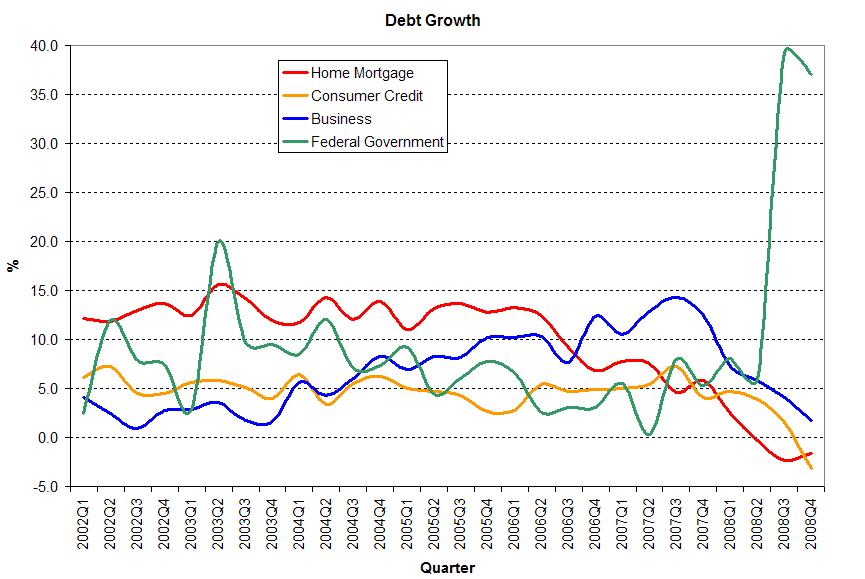 • Die angehaengte Graphik zeigt das Wachstum der Verbraucherkredite in den USA. Es geht derzeit drastisch zurueck und lag in Q4/08 nahe der Inflationsrate. Unter Einbeziehung des Zinsdienstes ensteht sogar ein Rueckgang der Geldmittel fuer die reale Wirtschafstleistung.