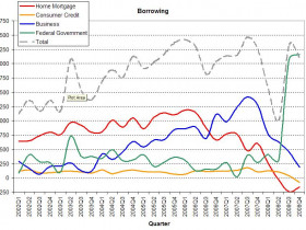 • Nach diesen Daten faellt das Wachstum der Schuldenaufnahme seit Beginn der Finanzkrise stark ab. Im privaten Sektor ist die Schuldenaufnahme sogar ruecklaeufig - die hier zur Verfuegung stehende Geldmenge schrumpft. Einzig die Staatsverschuldung explodiert. Da das Geldsystem ein geschlossenes System ist, muessen Zinsdienst, Tilgung, Inflation und Wirtschaftswachstum aus der Neuverschuldung finanziert werden.