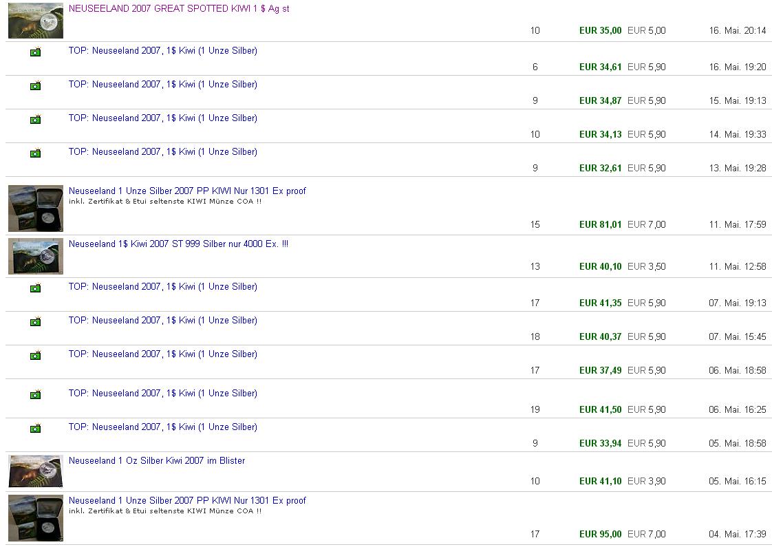 Die Silber Kiwi 2007 im Blister Preise gehen bei ebay derzeit etwas zurück. Im Hoch ca. 45€ zzgl. Porto, akt. 35€ zzgl. Porto (~ -20%).