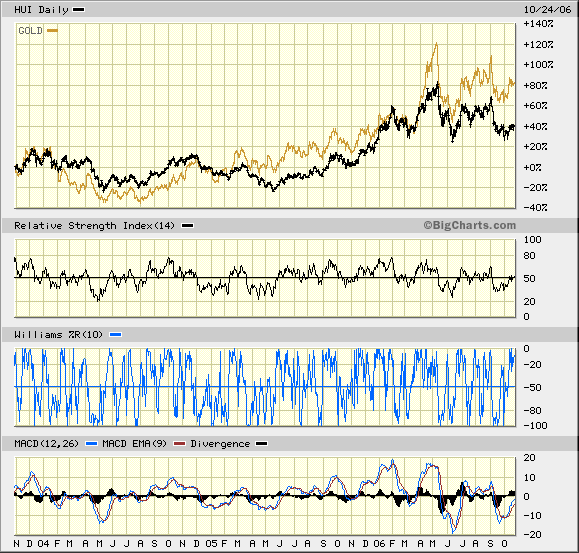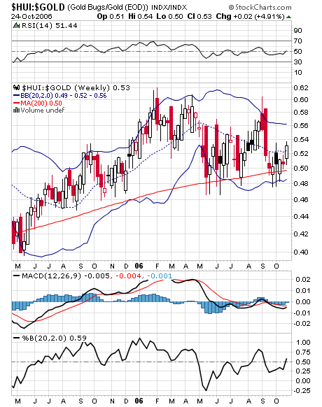 Generalizing, usually if this ratio is rising significantly it is during a major HUI upleg, as the HUI gold stocks tend to rise much faster than the gold they mine. If this ratio is falling significantly though, it usually means a major HUI correction is underway. Leverage is a double-edged sword, so gold stocks fall faster than gold in their periodic corrections. If gold falls slower than the HUI it is outperforming the HUI and lowering the ratio.