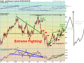 Nach einem erfolgreichem Breakout und anschliessendem *gesunden* Pullback zurueck zur Spitze Anfang MAI 2004, befand sich der RSI auf einem *gesunden* Level von 30 und ein anschliesssender Thrust nach oben haette den HUI mE weit ueber 275 gehievt bis der RSI wieder oben bei den 70ern angelangt waere. Der RSI war damals schon am Boden, und der naechste Aufwaertszyklus unaufhaltsam, doch der HUI crashte an 3 Tagen besonders stark ein, und der RSI ging gezwungenermassen kurzzeitig unter die 30er Marke, um von diesem tiefstmoeglichen (!) Boden zu steigen. Obwohl der RSI nur minimal einsackte, krachte der HUI stark von 210 auf 160 Punkte ein. Da der HUI sowieso am steigen gewesen waere mitsamt dem RSI, half dieser kuenstlich ausgeuebter Crash, die unaufhaltsame Aufwaertsbewegung (zyklus) VON EINEM ANDEREN *tieferen* NIVEAU starten zu lassen! Kurs und Preismanipulation ist mE zeitlich nicht willkuerlich, sondern gezielt zu gewissen Zeiten. Ziel ist den unaufhaltsamen Aufwaertstrend somit nicht nur zu verlangsamen, sondern vielmehr auf einem relativen Niveau zu halten, sprich vermeiden, dass gewisse Aufwaertszyklen nicht von einem hohen Preisniveau starten, sondern lieber von einem niedrigeren, damit der HUI zB nicht von 210 auf mind. 250 steigt, sondern waehrend dem Aufwaertszyklus von 160 auf 200. Wenn dieser jetzige Aufwaertstrend kurz durchschnauft (RSI ueber 70 und sackt ein) dann befindet sich der HUI eben nicht auf einem Kursniveau von mind. 250-300, sondern eben *nur* auf 210-250. Auf Jahre gerechnet macht dies enorm was aus, der HUI waere mE ohne schwarzmaechtige Preiseinfluesse seit 1999 auf einem vielfach hoeherem Niveau wie heute. Nicht umsonst reden Goldexperten die ganze Zeit darueber, dass der Goldpreis heute schon bei mind. 600 USD stehen muesste...